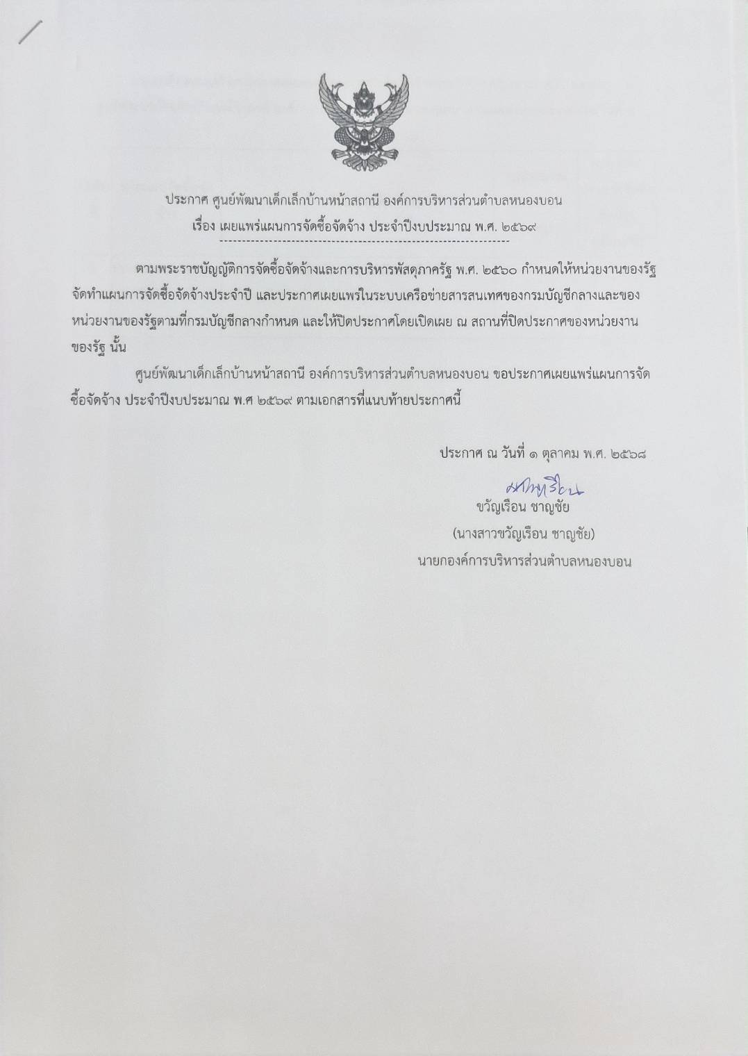 ประกาศ จ้างประกอบอาหารกลางวันเด็กเล็กของศูนย์พัฒนาเด็กเล็กบ้านหน้าสถานี ระหว่างวันที่ 1 ตุลาคม 2568 - 20 พฤศจิกายน 2568 |